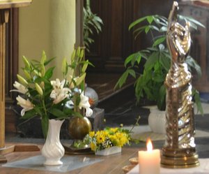 L’église de Blandain, lumineuse et largement fleurie aux tons jaune et blanc,